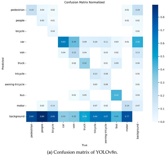 Regarding the identification of small objects such as “motor”, the baseline YOLOv8n model achieves a classification accuracy of only 19%, with a 14% probability of misidentifying “motor” as “bicycle”. However, through optimization in our optimal model, the recognition accuracy for “motor” increases to 25%, representing a 6% improvement over YOLOv8n. YOLO-DroneMS notably enhances the accuracy of drones in identifying pedestrians, vehicles, and other small objects.
