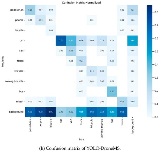 Comparison of confusion matrices of YOLOv8 and YOLO-DroneMS. It is seen that the “pedestrian” class has an increase of 9%, and the “people” and “car” categories have improved by 8% and 7%, respectively.
