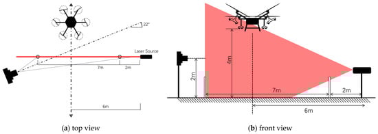 The laser light source used in this experiment has very high power to create a large-scale plane of uniform light intensity, which ensures that the laser can penetrate the droplets close to the light source. Even though the laser in this experiment was a line laser with a horizontal field of view of 45 degrees and a vertical field of view of 1.8°, according to standard calculations [30], it is still a highly dangerous laser light source at close range. Only when it is 5–10 m away from the laser can the energy of the laser be reduced to Class 1. Therefore, goggles and isolation measures are necessary in the method. This experiment was completed in the courtyard of the College of Agricultural UAV System which is surrounded by buildings about 5 m high. There is no light pollution problem, and a light shielding box is placed at the laser light source. In the non-image acquisition stage, most of the laser is blocked to create a safe test environment while ensuring continuous operation of the light source.