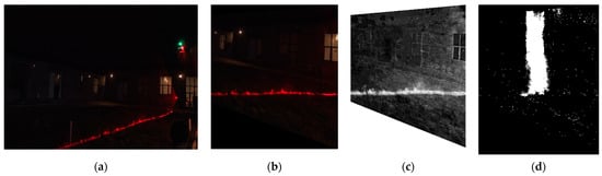Point cloud build process: (a) original image, (b) transformed image, (c) index image (white is 1, and black is 0), (d) binarized image (threshold 0.3).