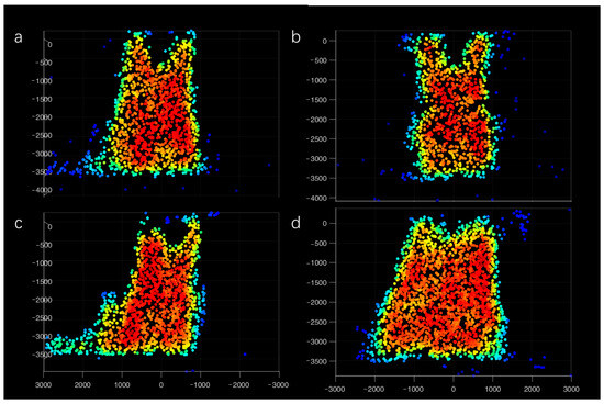 Downsampling was used to reduce the point cloud amount with the function [27] in Matlab (R2023b, Mathworks). The method of downsampling was “random”, and the rate was set at 0.001, which could keep the density distribution. After the downsampling, the density was calculated based on the total number of points within 100 mm of each point. Then, the density in one test was normalized with the highest density set as 1. The point size in point cloud visualization was suitably increased.