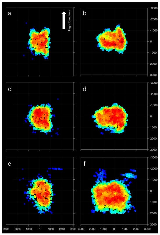 Figure 5 shows the horizontal distribution of the different UAV structures at different heights. Figure 5a,b show 1 m from the UAV, where the droplets were just generated by the nozzle. There was less difference between the target and conventional UAV structures in the center part. However, it is obvious that the droplets were generated from the nozzle when the nozzles were under the rotors, especially in Figure 5a. It also already showed in the pattern that the targeted UAV had a wider distribution. At 2 m away from the UAV, the droplets were not shown as a six-rotor pattern; they were mixed well already. The droplet distribution width of the targeted UAV had already grown to 2 m. At 3 m away from the UAV, there was a special pattern in the targeted UAVs, as shown in Figure 5f, where two droplet groups moved to the forward direction at both sides. The distribution width of the targeted UAV had grown to 3.5 m, which is shown in Figure 4d.