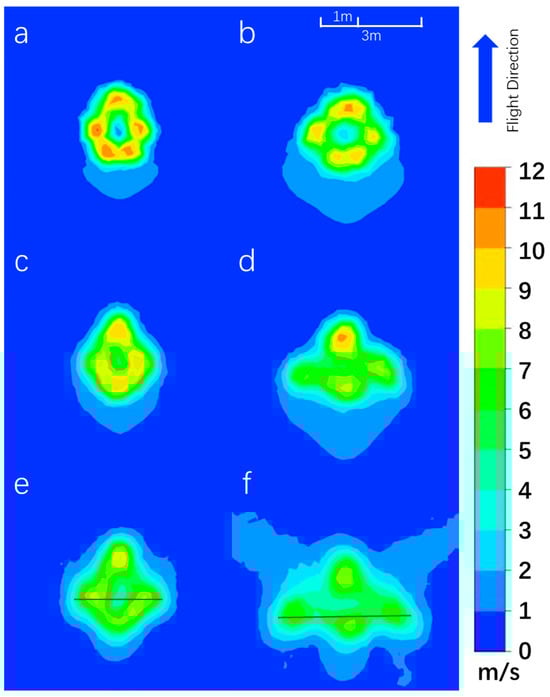 Simulated vertical distribution of the target and conventional UAVs at different distances from the UAV: (a) 1 m from conventional UAV, (b) 1 m from targeted UAV, (c) 2 m from conventional UAV, (d) 2 m from targeted UAV, (e) 3 m from conventional UAV, (f) 3 m from targeted UAV. The color means the absolute wind speed, where red is the highest and blue the lowest. The red line is the width of the wind speed higher than 5 m/s.