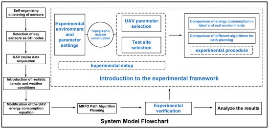 Figure 1 shows the system model of this paper: firstly, the sensors are self-organized clustering and selecting key sensors as cluster head (CH) nodes. After that, real terrain and weather conditions are introduced, and the UAV energy consumption equation is modified. The experiments include the experimental environment and parameter settings, the construction of terrain datasets and the selection of test locations, and comparison of energy consumption in ideal and real environments, as well as a comparison among different path planning algorithms. Finally, conclusions are analyzed based on the experimental results.