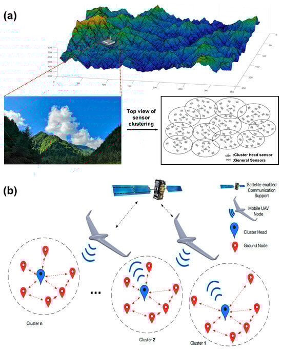 (a) Schematic diagram of sensor clustering preprocessing in the proximity region. (b) Schematic of communication data transfer between UAV and sensor CH.