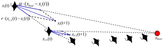The MRFO algorithm searches for better quality solutions in the solution space and is able to be able to reach the optimal solution in a fewer number of iterations as compared to other optimization techniques; as the complexity of the system increases, the MRFO algorithm takes more time, but it is still effective in finding the optimal solution. The chained foraging behavior of the MRFO algorithm allows individuals to form a chain-like structure in the search space, which improves the global search capability of the algorithm. This structure facilitates rapid exploration of the entire search space at an early stage to find potentially optimal solutions [,]. The cyclonic foraging behavior of the MRFO algorithm enhances the algorithm’s exploration capability by introducing random positions as reference positions. This behavior not only improves the exploitation capability but improves the exploration capability, allowing the algorithm to find the best solution globally. The somersault foraging behavior of the MRFO algorithm causes individuals to move around the food and somersault around a high concentration region (the current best solution). This behavior brings all individuals progressively closer to the optimal solution in the search space by gradually reducing the perturbations in their positions [,]. The MRFO algorithm is a novel bio-inspired algorithm that mimics the foraging behavior of manta rays, with unique chaining, cyclonic, and somersaulting foraging strategies, which allows it to excel in both the exploration and development phases. This flexibility allows it to optimize under different constraints and adapt to real-time limitations. Therefore, in this paper, the manta ray foraging optimization algorithm is chosen as the main algorithm for path planning engineering optimization in forest scenarios, and its biological working principle is shown in Figure 4.