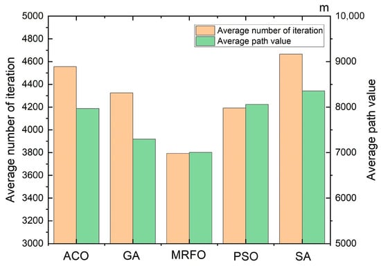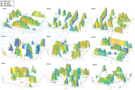 For the raw values of the metrics in Table 5, there are four categories: rate of convergence, accuracy, computation time, and quality of solution. The convergence rate metric describes how fast the algorithm is approaching the optimal solution, and here we set the convergence rate to be the number of iterations to reach 90% of the optimal solution. The accuracy metric measures the accuracy of the algorithm’s solution, i.e., the error between the obtained solution and the actual solution. Here we specify that the algorithm stops when it finds a suboptimal solution with an error of 2% from the optimal solution and compare the solution accuracy of the three algorithms at this moment. Computational time is the time taken for the algorithm execution to complete, usually measured in seconds or milliseconds. Here we specify the measurement of the time period from the beginning of the execution of the algorithm to the end to obtain the computational time. Considering that the real-world context requires the computation of a feasible flight path for a UAV in a finite amount of time, while also requiring data quality. We specify that solution quality is a metric derived from a combination of 40% path accuracy, 40% computation time, and 20% algorithm convergence rate, in order to leverage solution quality to portray the performance of different algorithms in real-world application contexts.
