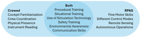 Venn diagram highlighting the core aspects of aviation that can be trained using simulators in crewed and uncrewed (RPAS) aviation, as well as both.