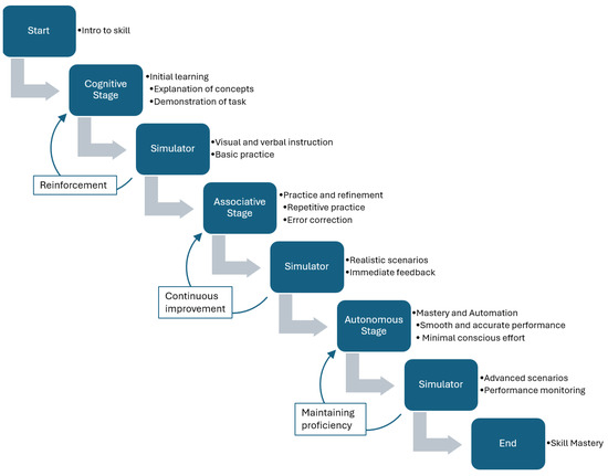 Simulation-based training in an RPAS simulator, incorporating instructivist educational principles, allows for a structured approach to the training of remote pilots prior to conduct of flight in the real world. Instructivism, as a pedagogical theory, is an educator-focused theory which understands learning as being a transfer of knowledge or skills from expert to novice. This theory, which is still the dominant principle by which pilots of crewed aircraft are trained [16], is less often applied in modern technology-based training [17]. The theory supports a structured, directly guided approach to education, which makes it ideal for, and prevalent in, highly proceduralized and safety-critical domains. The method of instructivism incorporating simulation as utilized in this research is illustrated in Figure 2. Instructivism, in this research, explicitly conveys the techniques and standards required, allowing for a clear understanding and application of drone piloting by the learner. The research is also framed within contextual learning [18], as the learner engages in hands-on and immersive experiences, which enhance mastery of flight procedures. It is important to note that there is a wide variety of educational methods or frameworks, and each of them could be applied to RPAS training in various ways, to produce different educational outcomes. A snapshot of this is given in Table 1.