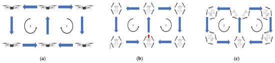 Vertical (a), horizontal (b), and yawing (c) square-circuit RPAS flight paths. Note, (a) is a front view, while (b) and (c) are top views.