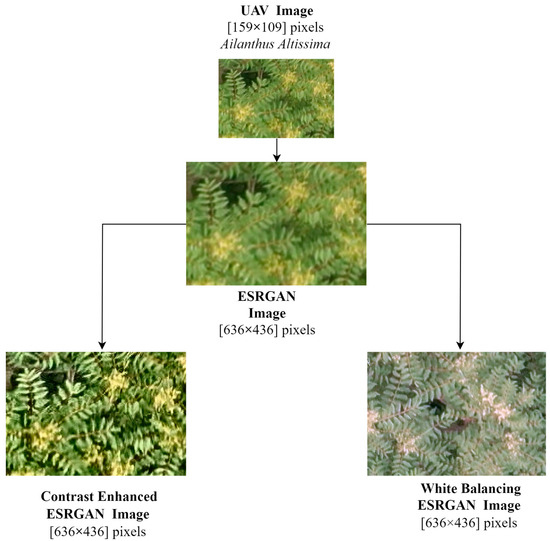 To improve the resolution of the images in our dataset, we utilized the Enhanced Super-Resolution Generative Adversarial Network (ESRGAN) [29]. ESRGAN is a deep learning algorithm specifically designed for image super-resolution, which involves creating high-resolution images from lower-resolution inputs. This is achieved through a generative adversarial network (GAN), where two neural networks compete as follows: one generates the higher-resolution image, and the other attempts to distinguish the generated image from a real high-resolution photo. This competitive process helps refine the system’s ability to create images indistinguishable from real ones. By improving the resolution of the UAV images, ESRGAN enhances the visibility of intricate plant features that are essential for accurate species classification in ecological research.