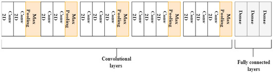 We employ a pre-trained VGG-16 model [32] as the backbone of our feature extraction process. This deep convolutional neural network is known for its robustness and accuracy in extracting relevant features from images. The VGG-16 architecture comprises 16 layers, including 13 convolutional and 3 fully connected layers, structured with (3 × 3) convolutional filters and interspersed with max-pooling layers. This uniform architecture facilitates the progressive extraction of intricate image features through hierarchical representation, as illustrated in Figure 3. Batch normalization applied after each convolutional layer enhances training stability and accelerates convergence rates.