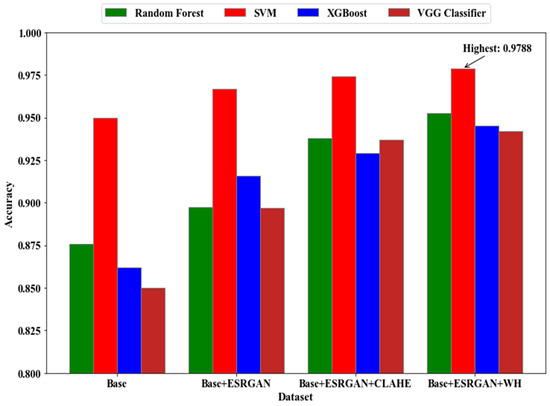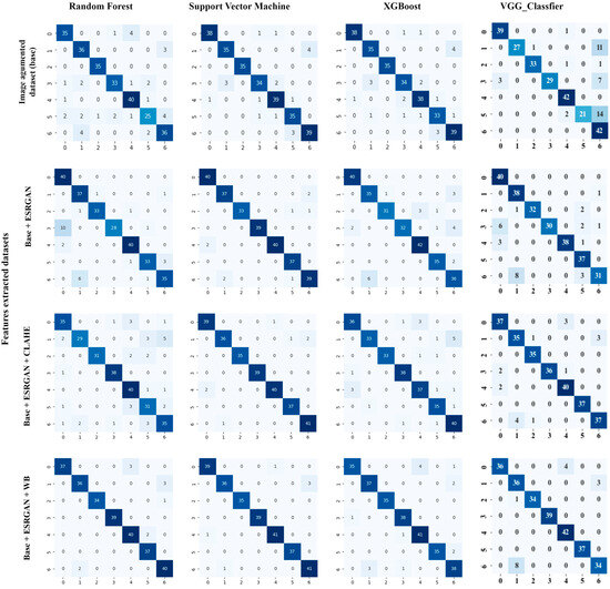 Figure 5 presents confusion matrices illustrating the classification results of four models (SVM, random forest, XGBoost, and VGG-16 classifier) across four different dataset enhancements: (1) base dataset, (2) Base + ESRGAN, (3) Base + ESRGAN + CLAHE, and (4) Base + ESRGAN + WB.