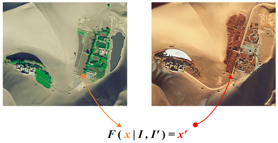 where I and I’ are the reference and target images, respectively, FΦ is the neural network structure, Φ represents the neural network parameter set, x represents a query point in image I, and x’ represents the corresponding position of x in image I’, as shown in Figure 1.