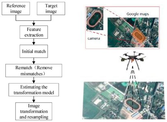 Image registration-based positioning technology is a highly autonomous and accurate navigation technique, which is an important means of navigation and a cutting-edge direction in the field of UAV autonomous navigation. By registering the images obtained by the drone with the map images, accurate autonomous localization of the drone can be achieved. The positioning process mainly consists of two steps: coarse positioning and fine positioning [4]. Firstly, the image obtained by the drone is roughly positioned on the map to obtain the rough corresponding image block of the aerial image in the map, achieving spatial positioning. Then, the multimodal image registration method proposed in this article is used to match feature points with the same name, and based on the geographic information carried by the feature points in Google Maps, the unmanned aerial vehicle is finally able to achieve autonomous localization [5]. This method is robust to intensity information. Feature-based methods mainly include three steps: feature detection, feature description, and feature matching. Feature detection involves extracting significant features from the two images, such as point features [6], edge features [7], and region features [8]. Feature description involves describing the extracted features for subsequent matching. Feature matching involves designing specific similarity measures for descriptors, establishing a geometric transformation model, and aligning the two images.