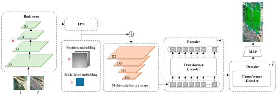 First, the two images with a size of H × W are input into the network model, and different levels of downsampled feature maps are extracted from the two input images using a shared-weight backbone network B. The feature maps of the two images are concatenated according to corresponding levels, with the output of the last residual block of each stage corresponding to a feature level in the feature pyramid. Then, position encoding P and multi-scale encoding S are added, generating fused multi-scale feature maps c through the feature fusion module, inputting the obtained feature maps and query points x into the Transformer encoder TE, and interpreting the results using the corresponding Transformer decoder TD. Finally, the output of the Transformer decoder is processed by a fully connected layer E to obtain the estimated corresponding point x’. The overall process of the network model can be expressed mathematically as follows: