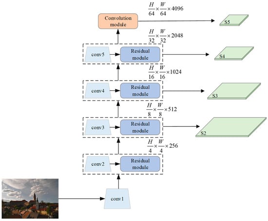 Specifically, the proposed network model uses an improved ResNet50 network as a bottom-up extraction architecture, calculating hierarchical feature representations composed of multiple scale feature maps using the output of the last residual block of each stage for subsequent feature fusion. Formally, the outputs of these residual blocks {S2, S3, S4, S5} correspond to the conv3, conv4, and conv5 stages and the output of the convolution module, with each output corresponding to a feature level in the feature pyramid. The outputs of the conv1 and conv2 stages are not included in the feature pyramid due to their large memory footprint.