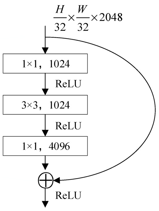The specific structure of the convolution module is shown in Figure 5. Similar to the residual module of ResNet50, the convolution module first uses 1024 1 × 1 convolution kernels to adjust the feature vectors to , reducing the number of channels, uses 3 × 3 convolution kernels to compress the feature map size to , and finally uses 4096 1 × 1 convolution kernels to increase the number of channels, adjusting the size to .