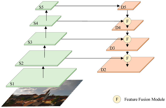 After the input image is fed into the network model, four different levels of feature maps are obtained. The feature fusion module is then used to fuse different levels of feature maps, iterating until the final feature map is generated. Specifically, S5 is obtained through convolution and pooling to obtain D5. Then, through lateral connections, S4 and the output of the previous layer D5 are sent into the FFM for feature fusion to obtain the output feature D4. Similarly, the output feature map D2 is obtained through the last FFM.