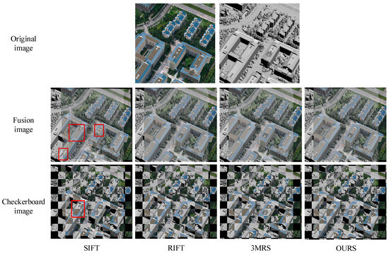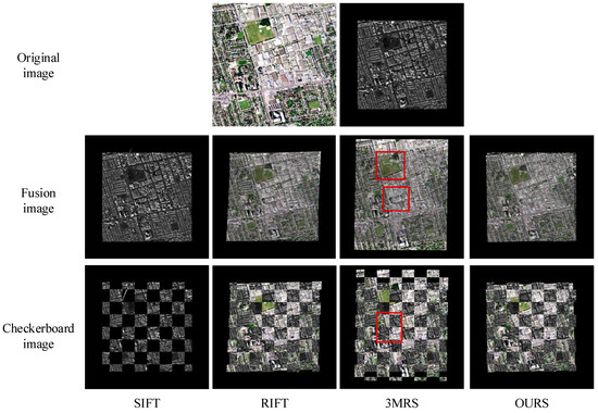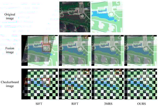 The areas marked in red boxes indicate registration errors with noticeable spatial misalignment or discontinuities. From the registration results, it can be seen that the fusion maps of the SIFT algorithm have relatively blurry object edges, and the checkerboard maps show many position offset and spatial misalignment issues. For example, in Figure 8, the circular flower bed shows serious misalignment, and in Figure 9, the buildings are not aligned. When dealing with image pairs with severe geometric distortions, such as in Figure 10 and Figure 11, the SIFT algorithm fails to find enough key point correspondences, directly leading to registration failure, and the output result is the original target image. The RIFT algorithm shows significant improvement over SIFT, achieving rough alignment for less challenging image pairs, such as in Figure 9. The RIFT algorithm can also effectively register images with scale changes, such as in Figure 11, but struggles with images with rotation changes. For example, in Figure 8, the road shows misalignment, and in Figure 10, the registration fails.