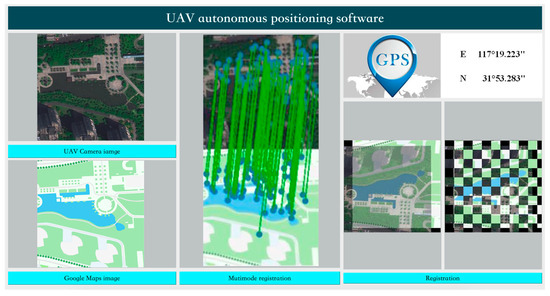 Traditional UAV (unmanned aerial vehicle) navigation systems use GPS (or better GNSS) for positioning from satellite signals [1], and inertial navigation systems are used when there is a short loss of satellite signals to communicate with ground control stations through continuous data links and determine the spatial position and attitude of the drone during flight. However, positioning algorithms have certain limitations, and the disadvantage of inertial navigation technology is that positioning errors accumulate over time. GPS navigation is susceptible to electromagnetic interference and cannot be used in denied environments. Under refusal conditions, drones typically utilize sensors, such as inertial navigation systems (IMUs) and visual sensors (such as cameras), to obtain information on flight status and the surrounding environment [2]. Among them, the camera sensor can obtain images of the ground and achieve positioning and navigation through multimodal image registration algorithms [3]. In response to the situation where unmanned aerial vehicles cannot provide accurate location information without GPS signals, this paper designs and implements an image registration-based auxiliary unmanned aerial vehicle autonomous positioning software platform.