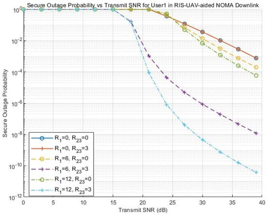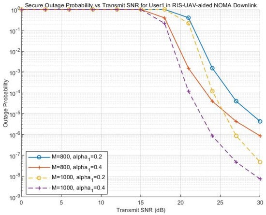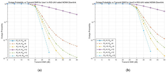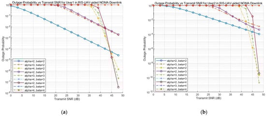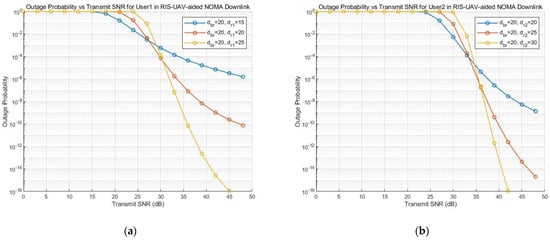 - Different from other studies, on the basis of researching the influence of RIS on the communication system under the circumstance of Rician fading, this paper, combined with the development of space–air–earth–sea integration information network, introduced NOMA technology to further improve the system performance in the Air-to-Ground LoS link scenario of the UAV cooperative communication and considered the user’s communication security performance under the presence of the eavesdropper.