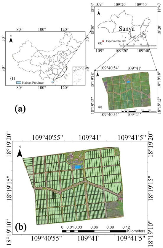 Study area and variety distribution map.I: Geographical location of Sanya City, Hainan Province; II: Geographical location of the study area; III: Overview of the study area. (a) Haitang Bay National Rice Park, Sanya City; (b) A map of the field layout of rice varieties in the study area.
