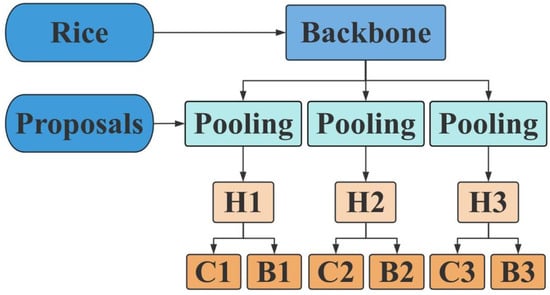 The first step in single-plant rice contour recognition is to build a model for target detection. A Cascade R-CNN is a deep-learning algorithm for target detection that improves and extends the R-CNN family of models. The architecture of a Cascade R-CNN is relatively complex and uses a backbone network to extract the image features. In a traditional R-CNN, a two-stage detection process is usually used. First, candidate regions are extracted using methods such as selective search; subsequently, classification and bounding box regression are performed on each candidate region. The Cascade R-CNN improves on this, as shown in Figure 3.