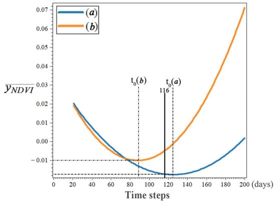 In Equation (4), (days) is the number of days of rice growth, and 0; is the NDVI value corresponding to the day; and are the model fit coefficients. The number of days corresponding to each NDVI value in Equation (4) is not a unique value; therefore, Equation (4) was derived to obtain Equation (5), which can be written as follows: