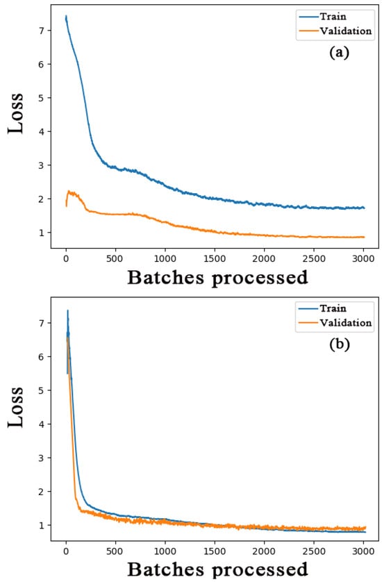 Comparison of loss function curves for SSD and Cascade R-CNN: (a) SSD model loss for training and validation sets, (b) improved the Cascade R-CNN model loss for training and validation sets.