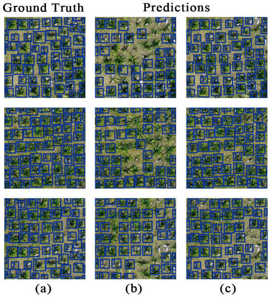 Comparison of single rice plant detection results: (a) ground truth, (b) SSD model predictions for single rice plant detection, (c) improved Cascade R-CNN model predictions for single rice plant detection.