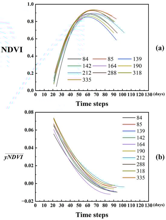As shown in Figure 7, under the same cultivation environment and planting density, the NDVI and time-series curves of different varieties were evidently different. The NDVI time-series curves of all varieties are shown in Supplementary Materials Figure S1, and the time-series curves of all varieties are shown in Supplementary Materials Figure S2. The NDVI increased from the regreening stage to the heading stage, reaching its maximum at the heading stage and showing a significant decreasing trend from the heading stage to the maturity stage (Figure 7a). The for different rice varieties exhibited a monotonically decreasing trend over time (Figure 7b). From the regreening stage to the heading stage, the growth rate of the NDVI slowed down gradually. The rate of decline of the NDVI accelerated gradually from the heading to the maturity stage. This is consistent with the pattern of change in rice chlorophyll content.