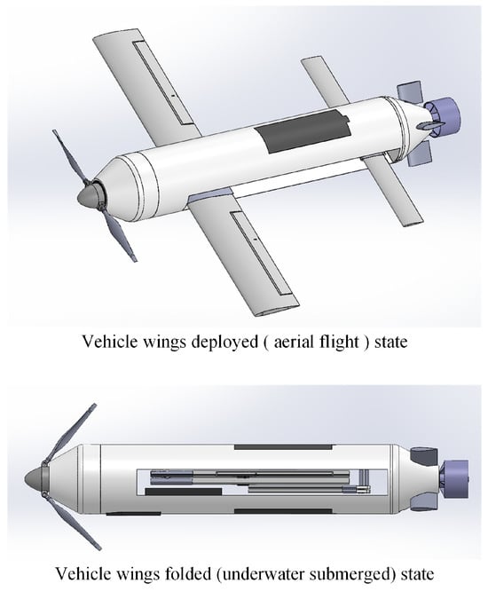 In the field of HAUVs, foldable wings have gained particular attention due to their ability to optimize aerodynamic performance during flight and reduce drag during underwater navigation. Recent studies by Chen et al. [27,28] have explored the dynamic behavior of HAUVs with foldable wings, enhancing their control systems to ensure smooth transitions between air and water. These designs allow vehicles to adapt their wing configurations based on the environment, thereby enhancing maneuverability, minimizing energy consumption, and improving mission flexibility. Sun et al. presented the design and field tests of a foldable wing unmanned aerial–underwater vehicle (UAUV) [7]. Chen et al. also introduced a foldable hybrid aerial underwater vehicle that combines the structural characteristics of torpedoes and loitering munitions [29].