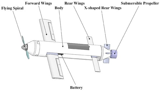 The overall structure of this foldable hybrid aerial underwater vehicle is shown in Figure 2. To meet the varying requirements of air flight and underwater navigation, the vehicle comprises a front foldable propeller mechanism, a body section, a foldable wings mechanism, a battery, an X-type rudder mechanism, and a tail submersible thruster mechanism.