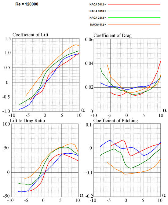 The four airfoils are imported into the xflr5 software for direct airfoil design, and the reynolds number re is selected as 120,000, resulting in the curves of lift, drag, pitching moment, and lift-to-drag ratio versus angle of approach for the four airfoils, as shown in the following Figure 5 and Figure 6.