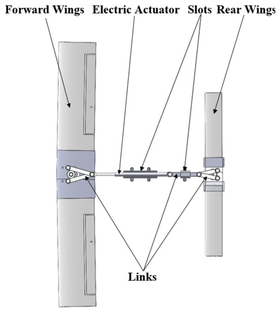 The deployed configuration of the wing is illustrated in Figure 7. Initially, the electric actuator advances along the actuator slots, propelling the two front wing links forward. Both the front left and right wings then pivot simultaneously in opposite directions, completing a 90° rotation until secured by the fuselage. Subsequently, the electric pushrods move rearward, causing both rear wings to rotate 90° concurrently in the opposite direction. This sequence culminates in the front and rear wings reaching a fully extended position.