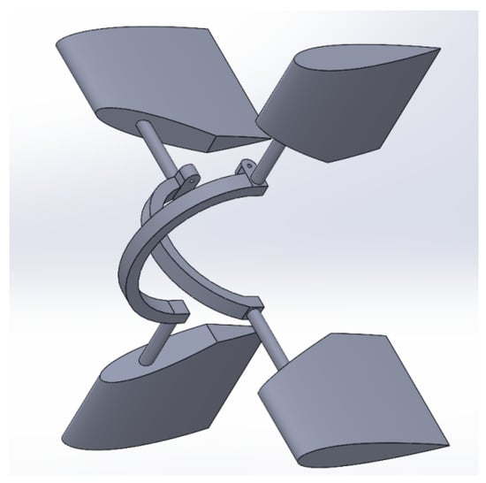 As shown in Figure 9, the X-type rudder mechanism is installed in the fuselage at the rear of the streamlined slewing body shell, with the tail of the underwater thruster mechanism positioned forward. The two rudder fixing shafts are semi-circular and placed symmetrically in the same plane, forming a 90° X-type configuration. Each rudder fixing shaft is attached to the head and tail ends of each rudder, resulting in four rudders arranged symmetrically along the vertical and horizontal planes.