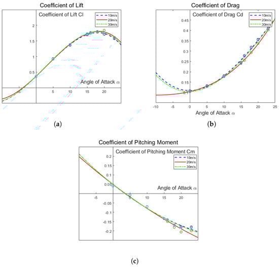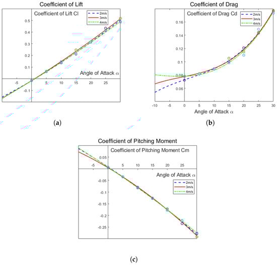 This methodology is employed to analyze the aerodynamic performance of the aircraft in flight. By varying the angle of attack, crucial aerodynamic parameters—such as lift coefficient, drag coefficient, and pitching moment coefficient—are derived and presented in Figure 11. From Figure 11, it is evident that variations in these aerodynamic parameters across different flight speeds can be effectively expressed through the angle of attack. The lift coefficient shows a direct correlation with both the angle of attack and speed, while the drag coefficient exhibits a linear relationship with the angle of attack, affirming that increased speed correlates with reduced drag.