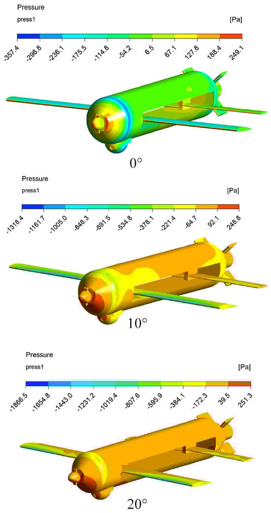 From the pressure distribution in Figure 16, a significant area of elevated pressure is observed beneath the front section of the fuselage. Negative pressure zones are primarily concentrated in the transition region between the front and central fuselage, characterized by substantial negative values. In contrast, the pressure in the fuselage’s center remains relatively stable, gradually increasing towards the rear. With rising angles of attack, minimal changes occur in the maximum pressure and positive pressure zones along the fuselage. The negative pressure region exhibits limited variation, while the minimum pressure gradually decreases across the studied range.