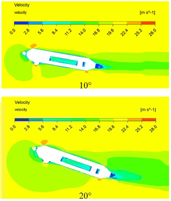 The near water surface fluid simulation results at the attack angle −15° and velocity 20 m/s.