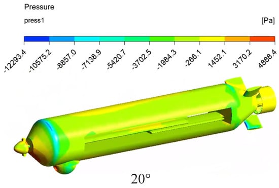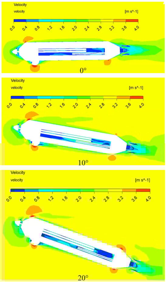 During the vehicle’s near-surface gliding phase, the boundary condition settings remain consistent with those used during water entry. Initial velocities of 10 m/s, 20 m/s, and 30 m/s are assigned to the vehicle, with the angle between the vehicle and the water surface set at −15°. Various modes of aerial underwater vehicle operation in different near-surface gliding states are obtained using these initial velocities.