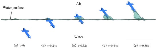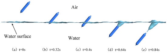Initial velocities of 20 m/s and 30 m/s are established for the vehicle. The angle between the vehicle and the water surface varies from 40° to 90°, with simulations conducted at 10° intervals. The process captures the vehicle’s entry into the water, as depicted in Figure 18.