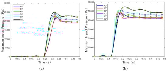 As seen in Figure 19, the impact force experienced during the underwater mode remains minimal until the vehicle contacts the water surface during the entry phase. Over time, as the vehicle descends further, the front portion of the fuselage contacts the water surface. Due to the significantly lower air density compared to water, the impact force rapidly escalates, reaching a peak value within a brief timeframe. Notably, the duration of this peak force is short-lived. Comparing maximum pressure peaks at different angles reveals that the vehicle experiences the smallest maximum impact force during water entry within the 40°–50° angle range.