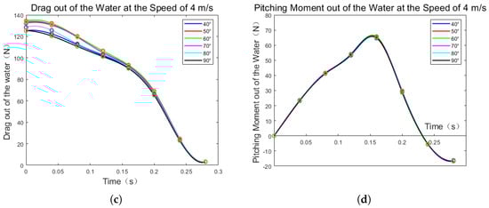 The drag force and pitching moment of the vehicle during water exit are illustrated in Figure 21. It is evident from the figure that both the drag force and pitching moment show limited sensitivity to changes in the water exit angle but are significantly affected by the vehicle’s speed. At a velocity of 3 m/s, the maximum drag force is approximately 75 N, and the maximum pitching moment is around 38 N·m. As the speed increases to 4 m/s, both the maximum drag force and pitching moment rise substantially, reaching about 130 N and 70 N·m, respectively. Notably, the curves of drag force and pitching moment versus time exhibit consistency across different speeds.