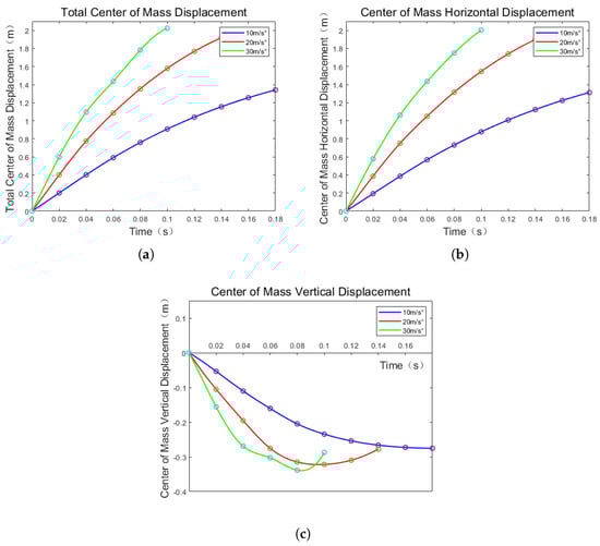 The center of mass displacement at different velocities in near water surface state. (a) The total displacement diagram of center of mass; (b) The horizontal displacement diagram of center of mass; (c) The vertical displacement diagram of center of mass.