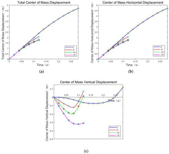 Vehicle center of mass displacement at different angles in near water surface state. (a) The total displacement diagram of center of mass; (b) The horizontal displacement diagram of center of mass; (c) The vertical displacement diagram of center of mass.