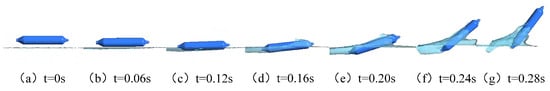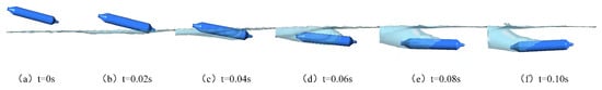 Figure 24 depicts the entire process of the vehicle gliding near the surface of the water with an initial velocity of 20 m/s and an initial angle of 15° at different times. The vehicle is initially located near the water’s surface. At t = 0.02 s, the front part of the vehicle fuselage begins to contact the water surface, and the vehicle is gradually submerged. As time progresses, after t = 0.04 s, the front part of the vehicle fuselage breaks through the water surface, creating a cavity at the rear. Due to the high speed, a cavity bubble forms at the front of the vehicle fuselage. Buoyancy influences the vehicle’s pitch angle, causing the angle between the vehicle and the water surface to decrease while expanding the cavity range.