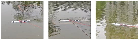 Finally, we applied waterproof sealing to protect all critical components of the prototype, including the battery, ESC, motor, flight control board, receiver, and the entire system. We retracted the actuator to fold the front and rear wings, allowing them to integrate seamlessly into the vehicle’s body. The operational dynamics of the vehicle prototype on the water surface are visually depicted in Figure 28. The underwater speed is about 11 km/h, which falls in the underwater speed range [2, 4] m/s analyzed in the simulation, as shown in Figure 15. The experimental findings confirm the feasibility and effectiveness of the proposed prototype.