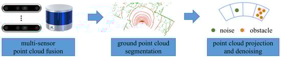 In order to perceive the environment stably and reliably in real time to avoid collisions, the vehicle must use a variety of sensors to accurately perceive the surrounding environment. Due to its accurate range information, 3D light detection and ranging (LiDAR) has the ability to operate in low-light conditions [3]. However, although 3D LiDAR has a wide FOV horizontally, it has a relatively small FOV vertically. For example, the Velodyne HDL-32 LiDAR has a horizontal FOV of 360, but a vertical FOV of only 40 (−25~+15), which is not able to sense lower obstacles in the proximal part of the unmanned vehicle. In addition, the LiDAR sensor is usually installed in the center of the UGV. If the UGV is too high or the LiDAR sensor cannot achieve 360 horizontal coverage due to the body of the UGV, it is necessary to add new sensors in the blind spots of the LiDAR sensor. Therefore, in order to ensure the safety and reliability of UGVs during operation, multiple sensors are usually integrated to collect point clouds to realize seamless environment sensing. Three-dimensional LiDAR and multiple depth cameras combination sensing are widely used as the sensing source for various types of UGVs [4]. However, the large amount of data collected by 3D LiDAR and multiple depth cameras can be overwhelming. To be specific, one 32-wire LiDAR sensor and four depth cameras generate more than one million data points per frame. These data usually include not only information about surrounding objects, but also ground data, which can be considered redundant for object detection, classification, and tracking [5,6]. On the one hand, these large numbers of point clouds will lead to the inability to detect obstacles in real time, which increases the risk of a collision. On the other hand, there are non-negligible noise points in the point cloud, which may lead to incorrect identification of obstacles. It is difficult for existing methods to achieve real-time performance and accuracy simultaneously, which makes rapid and accurate obstacle detection from dense point clouds a significant challenge [7].