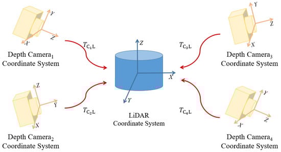 The schematic diagram of coordinate transformation. represents the relative pose relationship from the i-th depth camera to the LiDAR sensor.